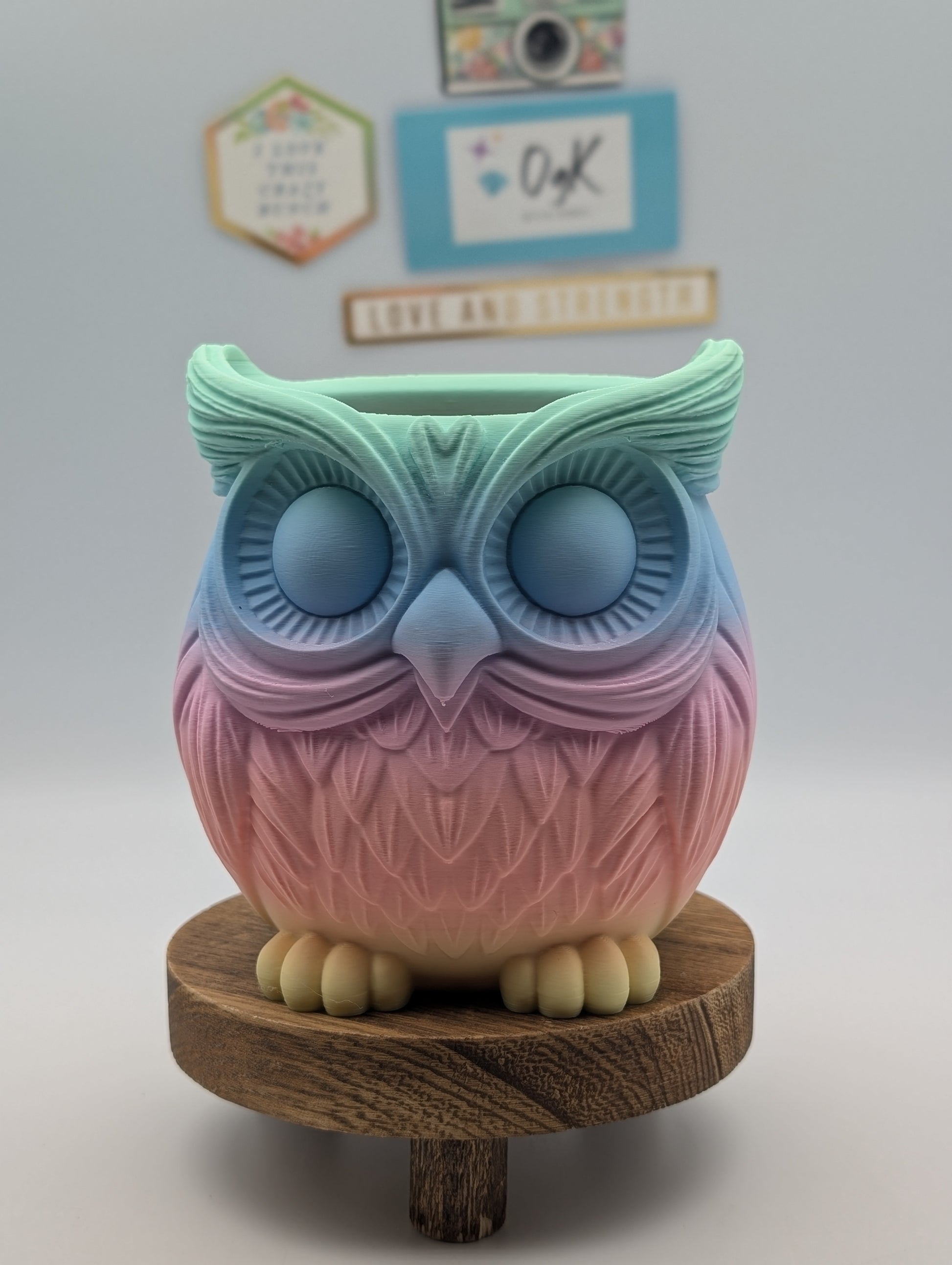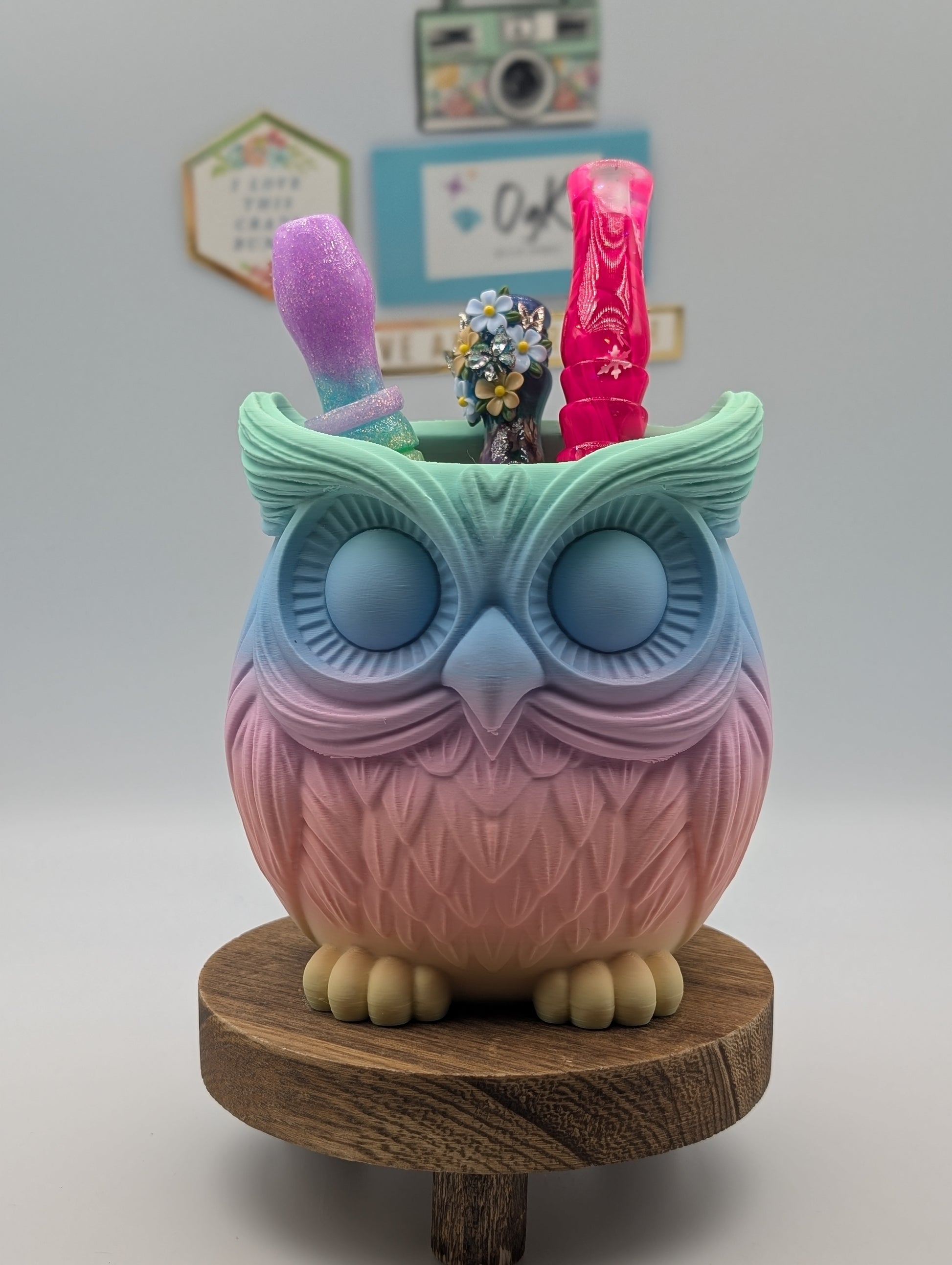Each caddy is 3D-printed with precision, revealing intricate feather textures, expressive owl features, and a smooth interior cup perfect for holding multiple tools upright. It's both functional and decorative, making it a delightful addition to any desk, craft table, or studio.
