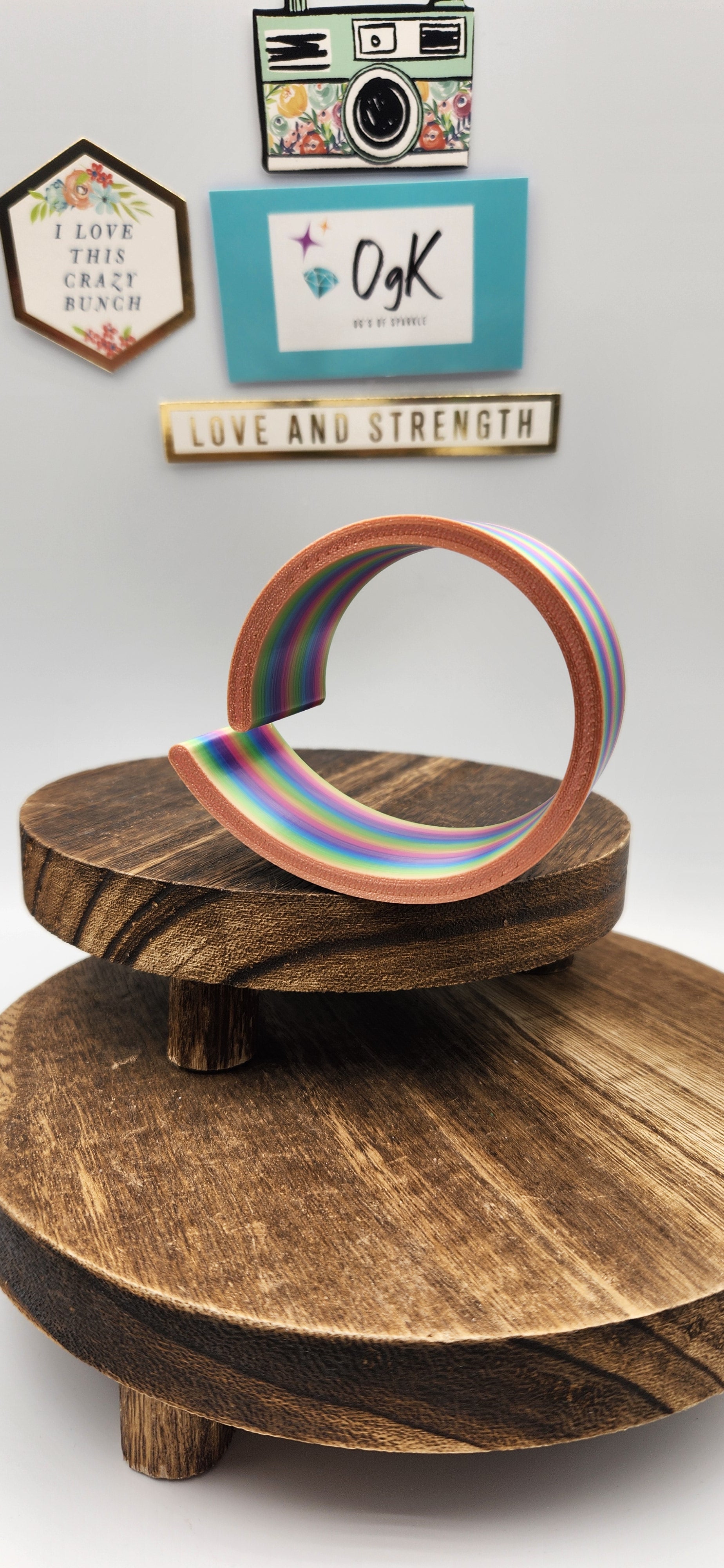 Each piece is 3D printed in rainbow filament, giving it a vibrant layered finish. Since they are produced in batch runs, some Curlies may look nearly identical, while others will show subtle variations in color placement.